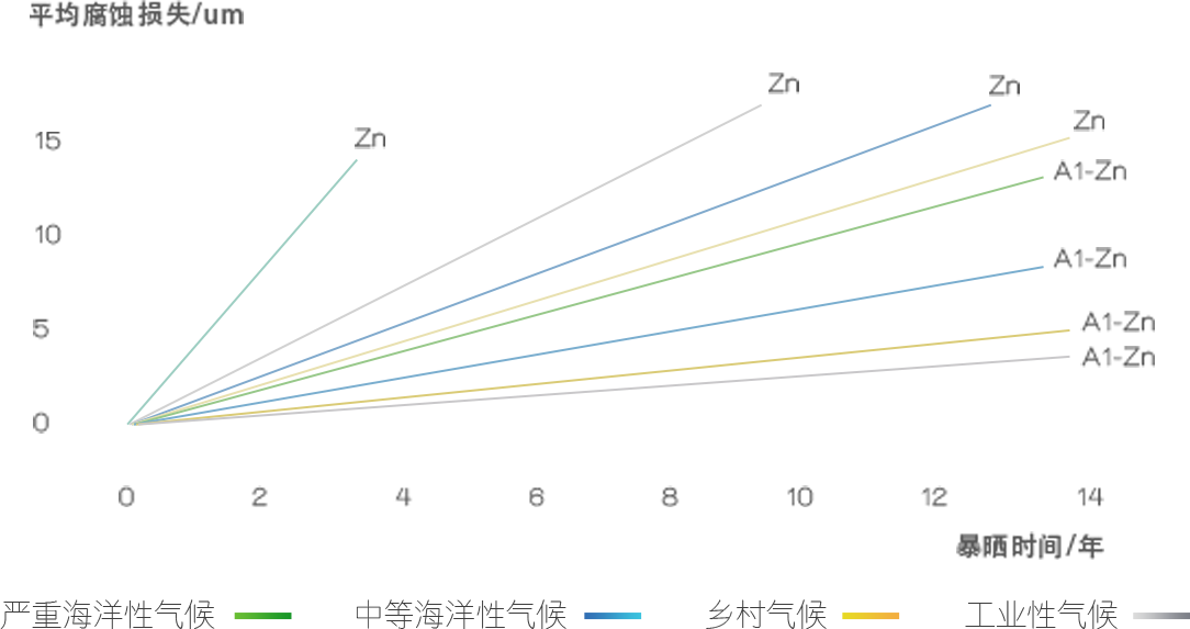 目前,建筑用彩涂板的鍍層一般有兩種:熱鍍鋅和鍍鋁鋅。鍍層厚度越大,耐腐蝕性能越好。 鍍層厚度主要是影響到彩涂鋼板的切口腐蝕性能,切口腐蝕是電化學(xué)腐蝕,影響因素有預(yù)處理層、底漆、基板厚度、鍍層厚度等。